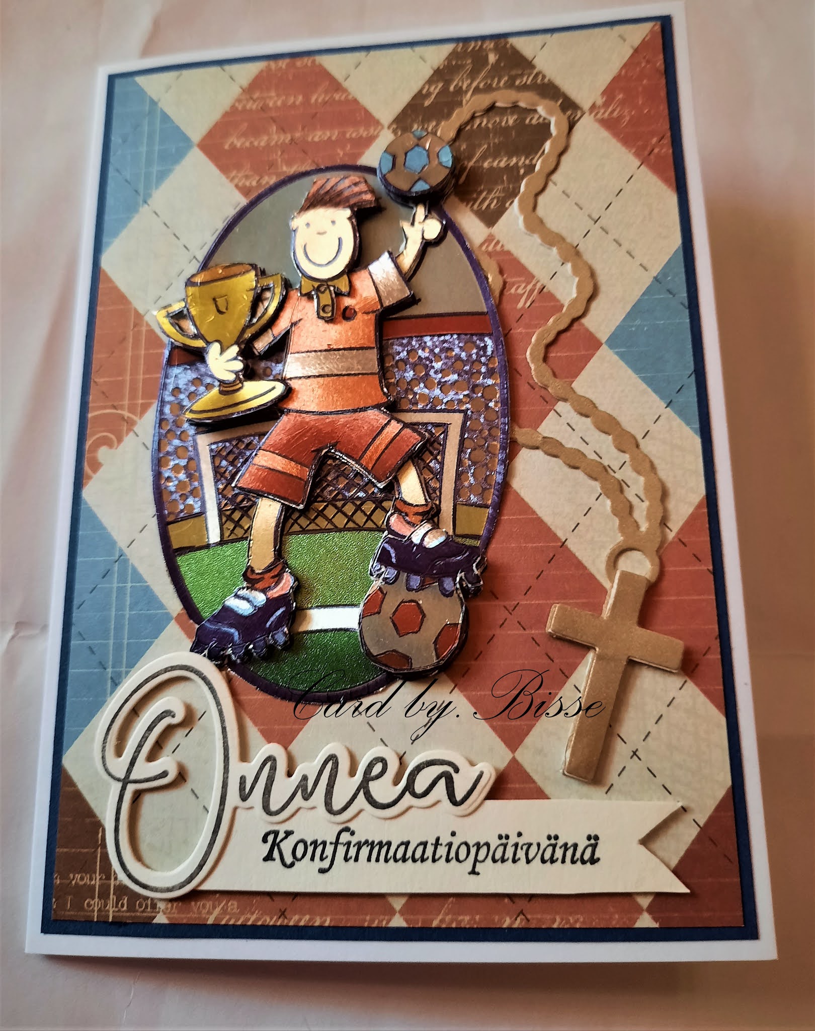 Heidin korttipajan onnea setin leima ja stanssi yhdistettynä oman varaston rippiteksteihin.Nuo saattevat olla Taitotalo Paperinauhan seteistä.